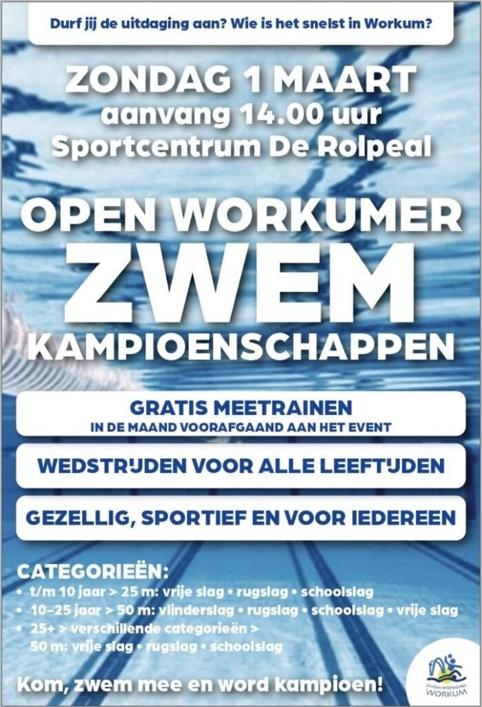 Zondag 1 maart a.s. zijn er weer onze clubkampioenschappen, maar dit jaar pakken we het een keer anders aan: we combineren onze vertrouwde clubkampioenschappen met het Open Workumer Kampioenschap! Zo zwemmen clubleden én andere enthousiaste zwemmers samen in één sportieve, gezellige wedstrijdmiddag. Er zijn prijzen voor onze clubkampioenen en aparte prijzen voor het Open WK.